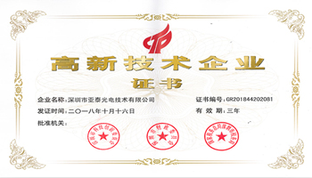近日,我司收到深圳市科創委、深圳市財政委員會、國家稅務總局深圳市稅務局聯合頒發的高新技術企業證書,標志著我司順利通過2018年 “高新技術企業”復審認定。這也是對深圳市亞泰光電技術有限公司多年來堅持自主研發、技術創新、堅持走高新技術發展道路的有力肯定。
