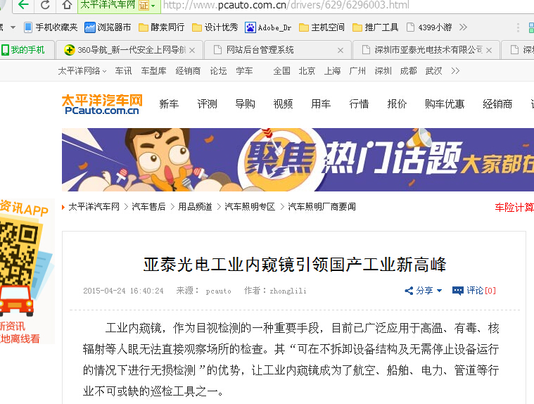 為改變這種局面,作為“國家高新技術(shù)企業(yè)”的深圳市亞泰光電技術(shù)有限公司,自2009年開始著手對工業(yè)內(nèi)窺鏡的研發(fā)工作,成立了光學(xué)事業(yè)部并特別聘請了深圳大學(xué)牛憨笨院士作為技術(shù)顧問,經(jīng)過不懈的專研與努力,亞泰光電公司不僅擁有了自己的工業(yè)內(nèi)窺鏡產(chǎn)品,并先后獲得了5項(xiàng)工業(yè)內(nèi)窺鏡方面的發(fā)明專利。近日,由亞泰光電自主研發(fā)的“百萬級像素”的超清視頻內(nèi)窺鏡已成功問世,選用國產(chǎn)自主研發(fā)高端產(chǎn)品不再是夢。