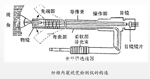 工作原理:由高品質的傳像纖維來傳送圖像, 通過目鏡直接觀察。纖維窺鏡由插入部(前端部、彎曲部與柔軟部)、操作部與目鏡部組成。傳像纖維束, 光纖及調校前端擺頭角度的鋼絲均全部內置。并且另配有專用的冷光源。