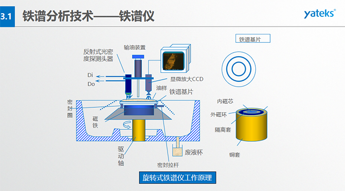 旋轉(zhuǎn)式鐵譜儀工作原理:輸油裝置、鐵譜基片、反射式光密度探測頭器、顯微放大CCD、密封圈、磁鐵等