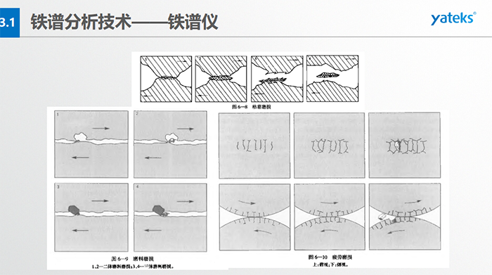 鐵譜儀的優(yōu)劣勢-優(yōu)勢:通過對金屬磨粒的形貌、大小及成分的微觀分析,直觀地獲得機(jī)械主要摩擦副表面的磨損情況(磨損類型,磨損程度,磨損部位等); 弱勢:分析速度慢,油液通過能力低,操作繁瑣費時,較大程度依賴于技術(shù)人員專業(yè)知識和經(jīng)驗積累