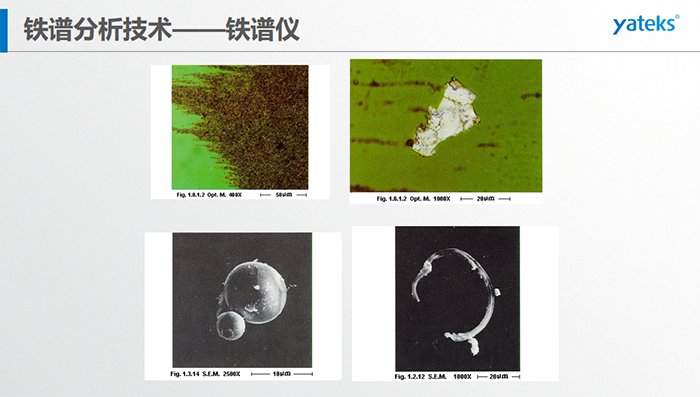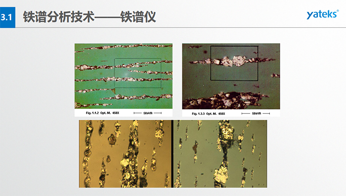 基本概念:檢測在用油中磨損顆 粒的形 狀、成份、大小和數(shù)量;檢測方法:磁場沉積、顯微鏡分析判斷。